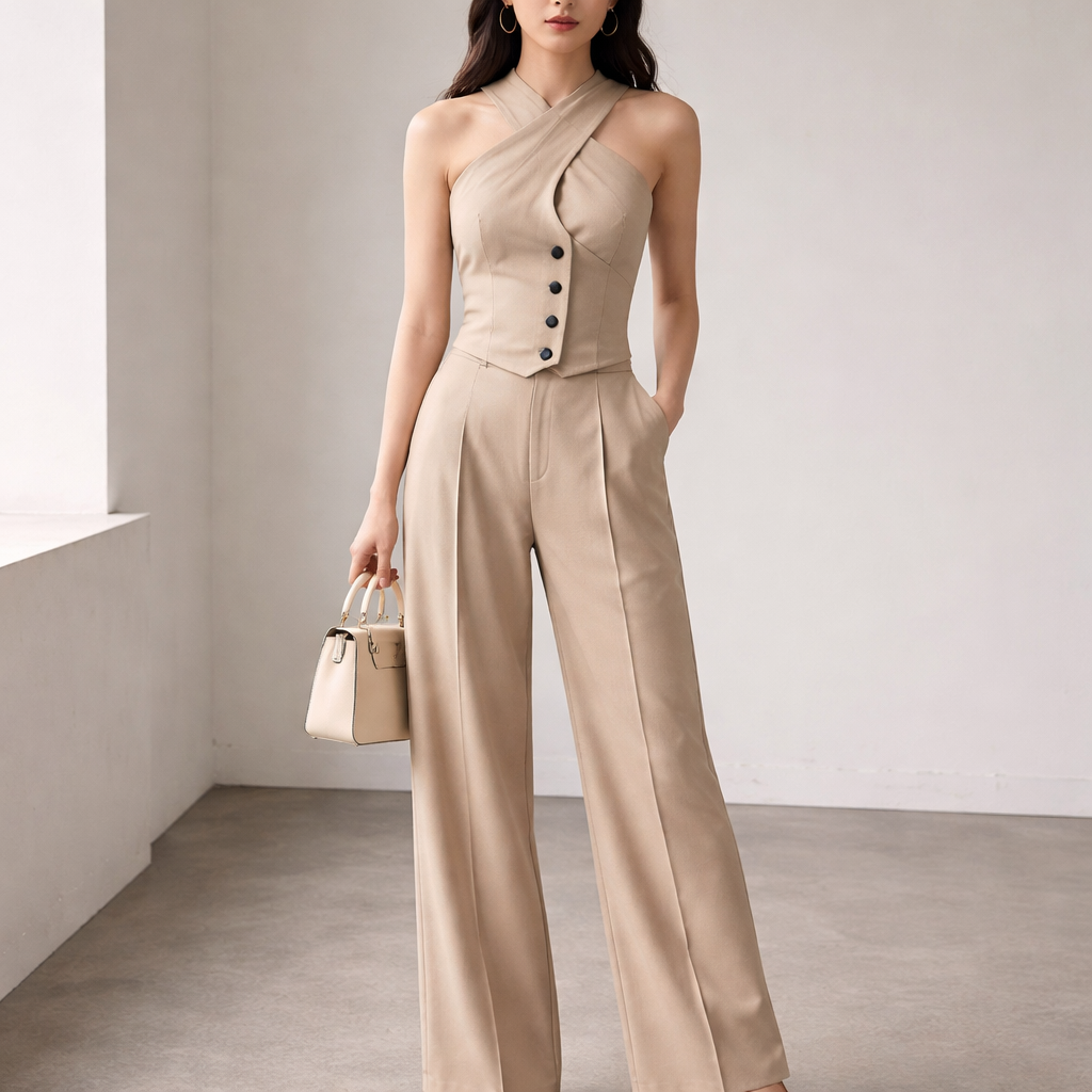 Japanese thickly crossed haltered 2 piece set. Only 3 medium sized buttons. No pockets on back or breast area. No crop top. Pants are loose and flared. Thick suit material.