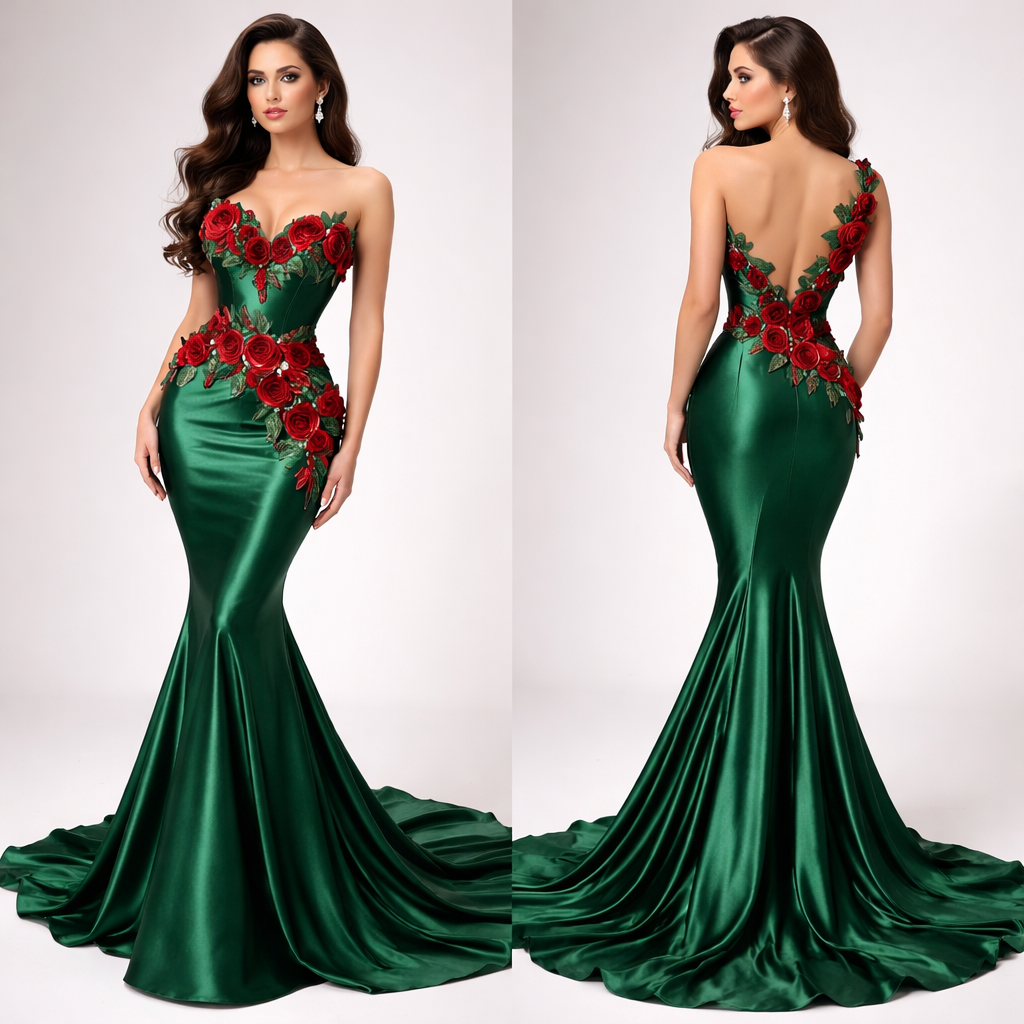 Silk green fabric, red rose with leaves around waist and front chest and the back .mermaid shape, long dress, classic style, show front and back