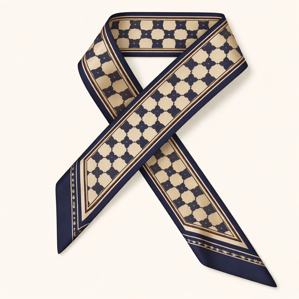 Design a 5x86cm silk scarf. Classic heritage look. With a simple repeated pattern using different shades of 1 or 2 colors.