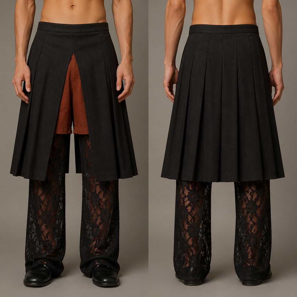 photorealistic fashion design, A Male Skirt design, suitable for Spring. A Male Skirt design, suitable for Spring. can you design a 3/4 pleated black linen skirt with a central cut out with a rust coloured canvas shorts and a black lace trousers. Design with modest coverage., just the design no text, show front and back