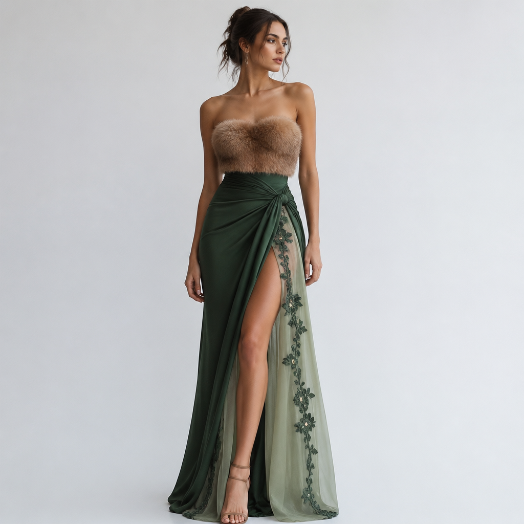 A Female Dress design, in Casual style. the chest area is light brown fur and the hip/waist area is dark green and the opening between legs is light green chiffon and with flowry dark green laces. SY fashion aesthetics.