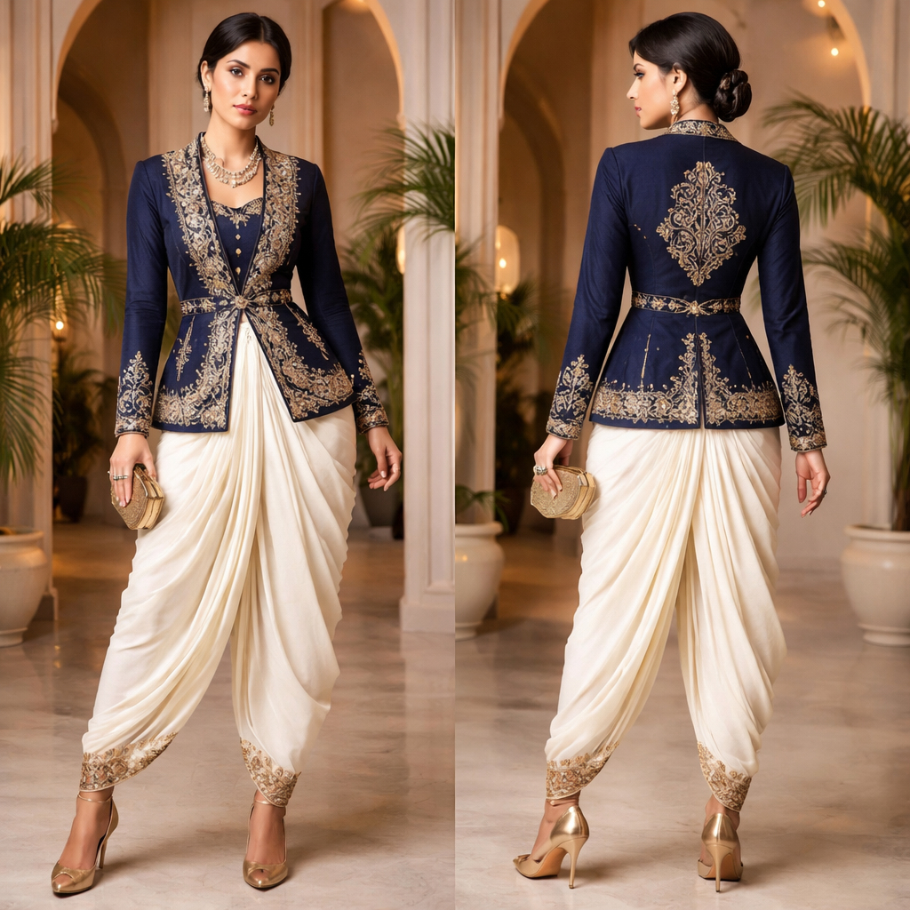 UnStitched Dhoti and jacket top for women - add traditional flair , business style, show front and back