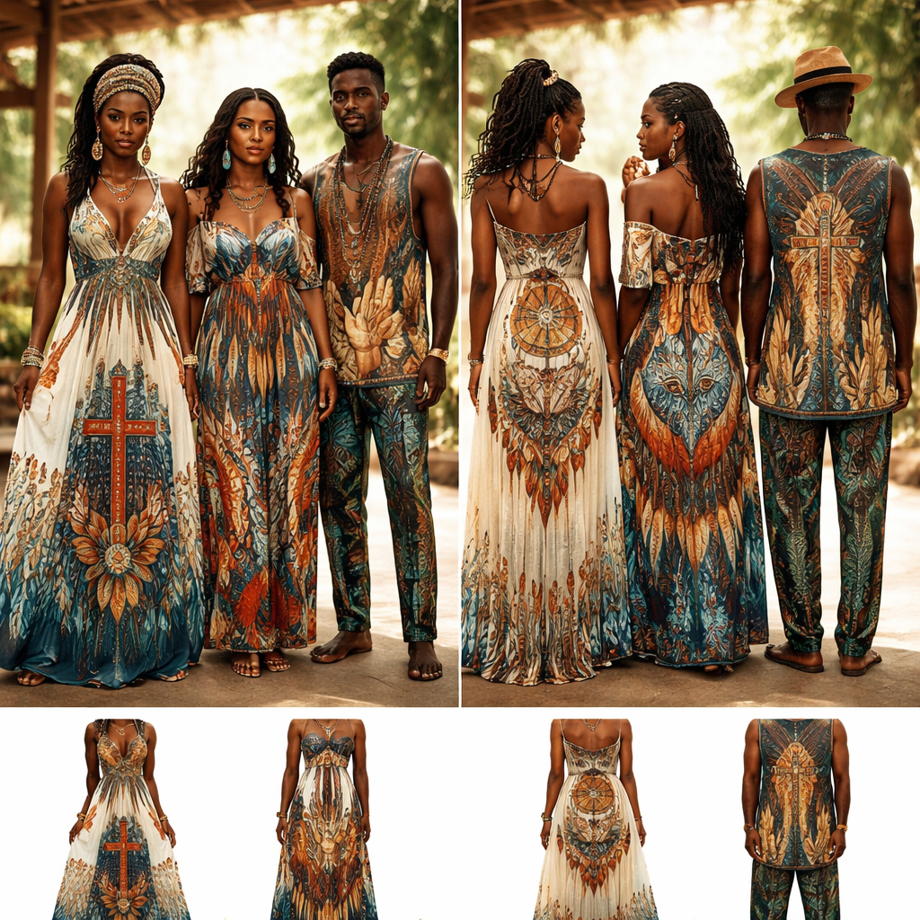 African, West Indies, Native American, rooted in faith, mental health awareness, black men, black women, indigenous women, indigenous men, not too revealing , resort style, show front and back