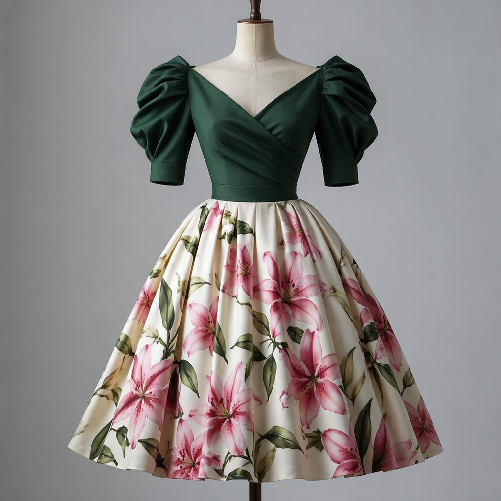 A Female Dress design. платье в стиле 50 годов, юбка полусолнце принт розовые лилии, лиф однотонный темно зеленый, корот...