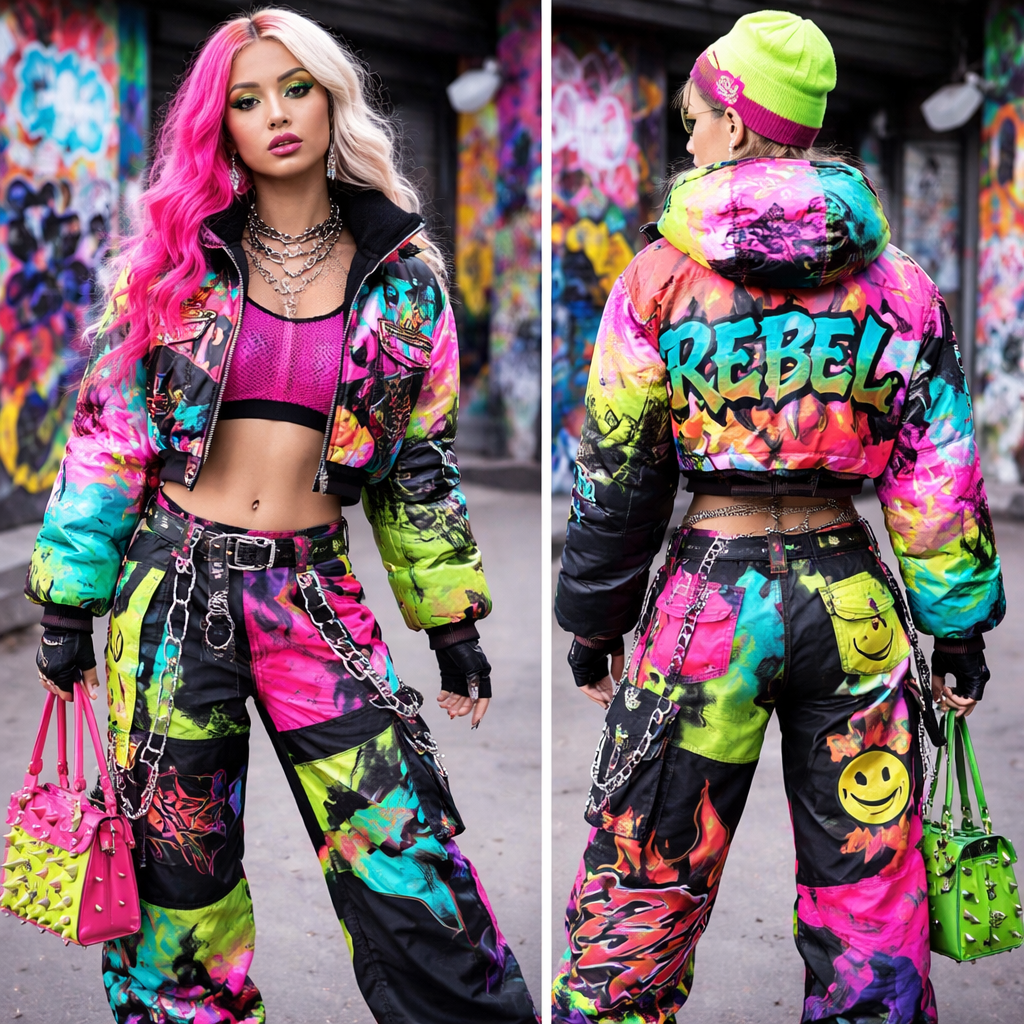 Sick streetwear, new fashion design for stylish women. Bright colors mixed edgy looks And patterns , streetwear style, show front and back