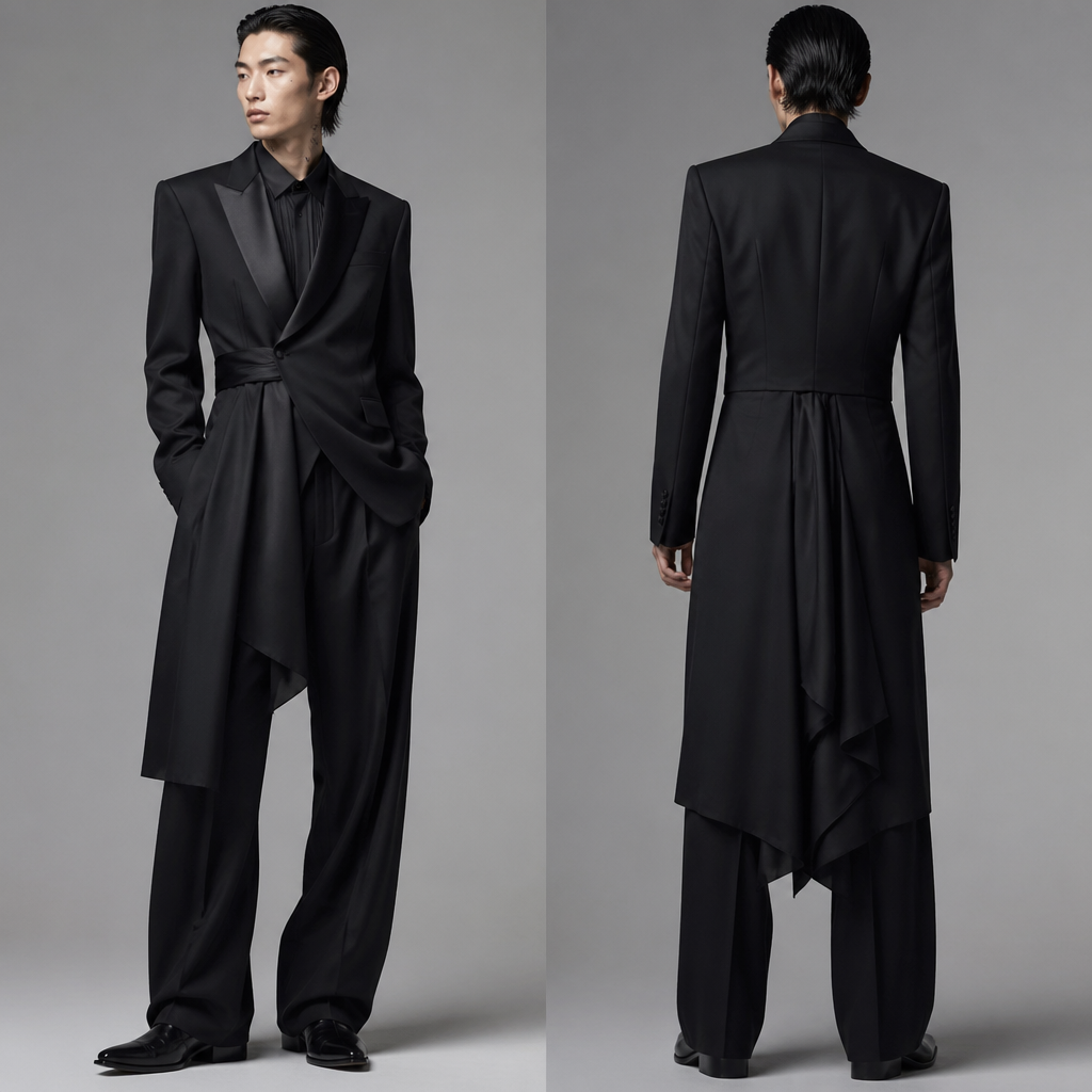 photorealistic fashion design, in Japanese Street style. Un traje de noche tipo esmoquin muy elegante. VE fashion aesthetics., japanese_street style, just the design no text