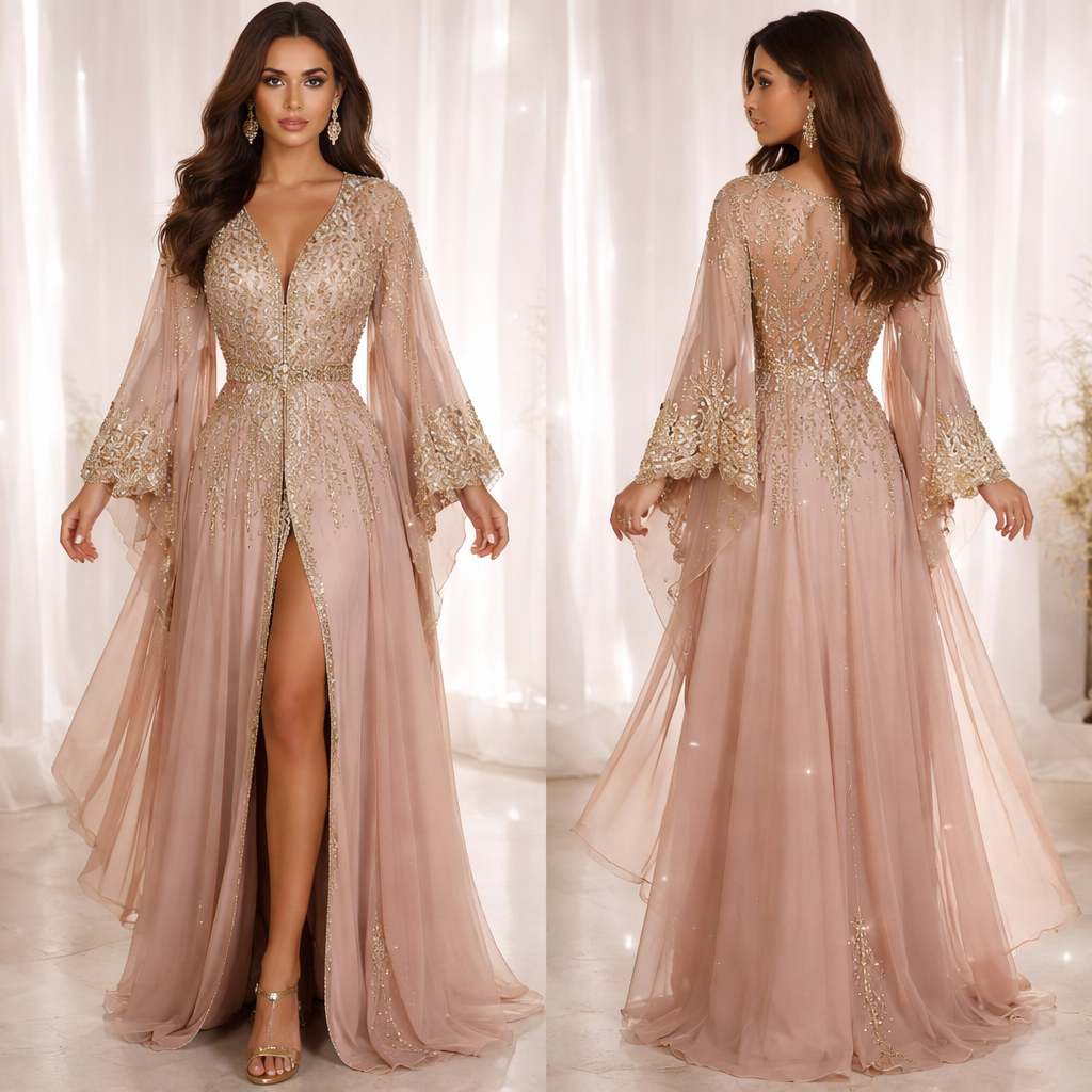 Jalabiya and Caftans for petite women, glamorous style, show front and back