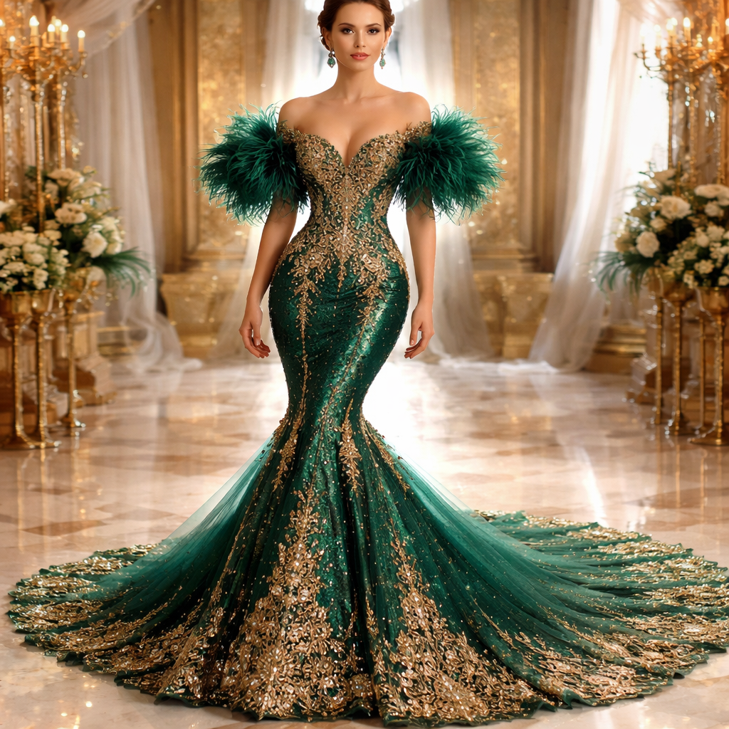 Emerald green Ang gold mermaid wedding dress with feathered sleeves
