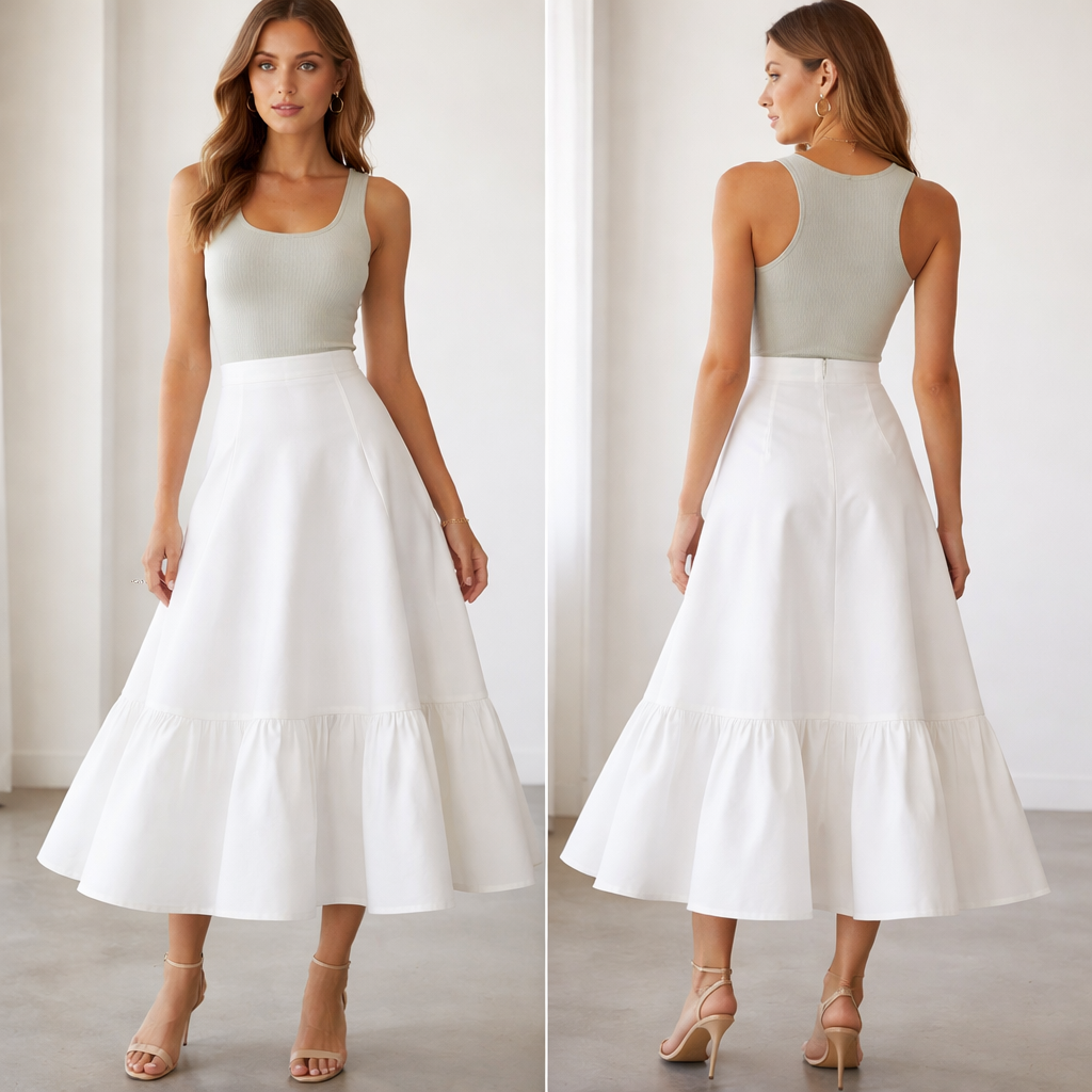 a crisp, optic-white cotton poplin midi skirt. I want it to have weight, so it holds that sharp A-line shape, but with a deep, tiered hem to give it movement when you walk. We’re doing a high-rise waist to elongate the frame. form-fitting, ribbed knit tank in a pale sage, show front and back
