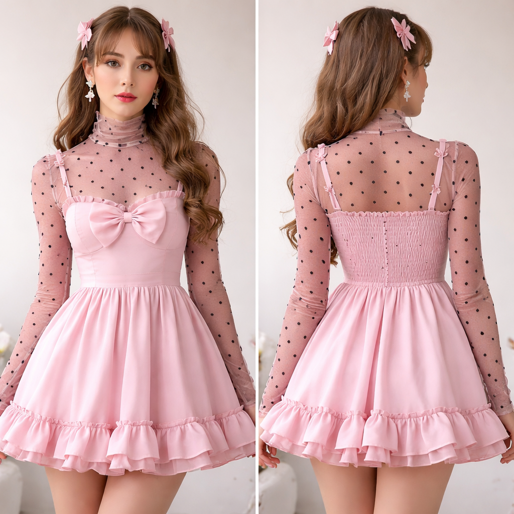 Pink babydoll dress worn with pink and black polka dot sheer turtle neck shirt , show front and back