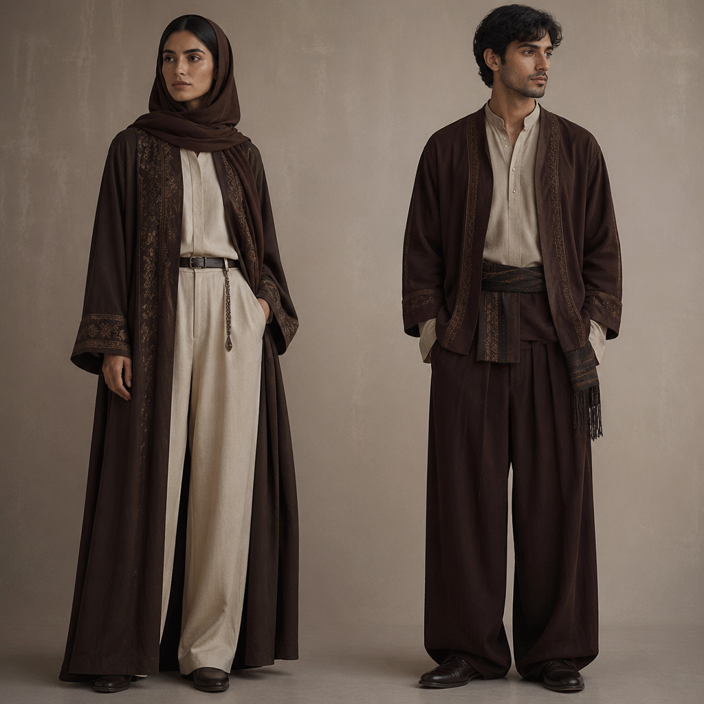 A Unisex fashion design, suitable for Summer, in Dark Academia style. Saudi Arabia fashion aesthetics.