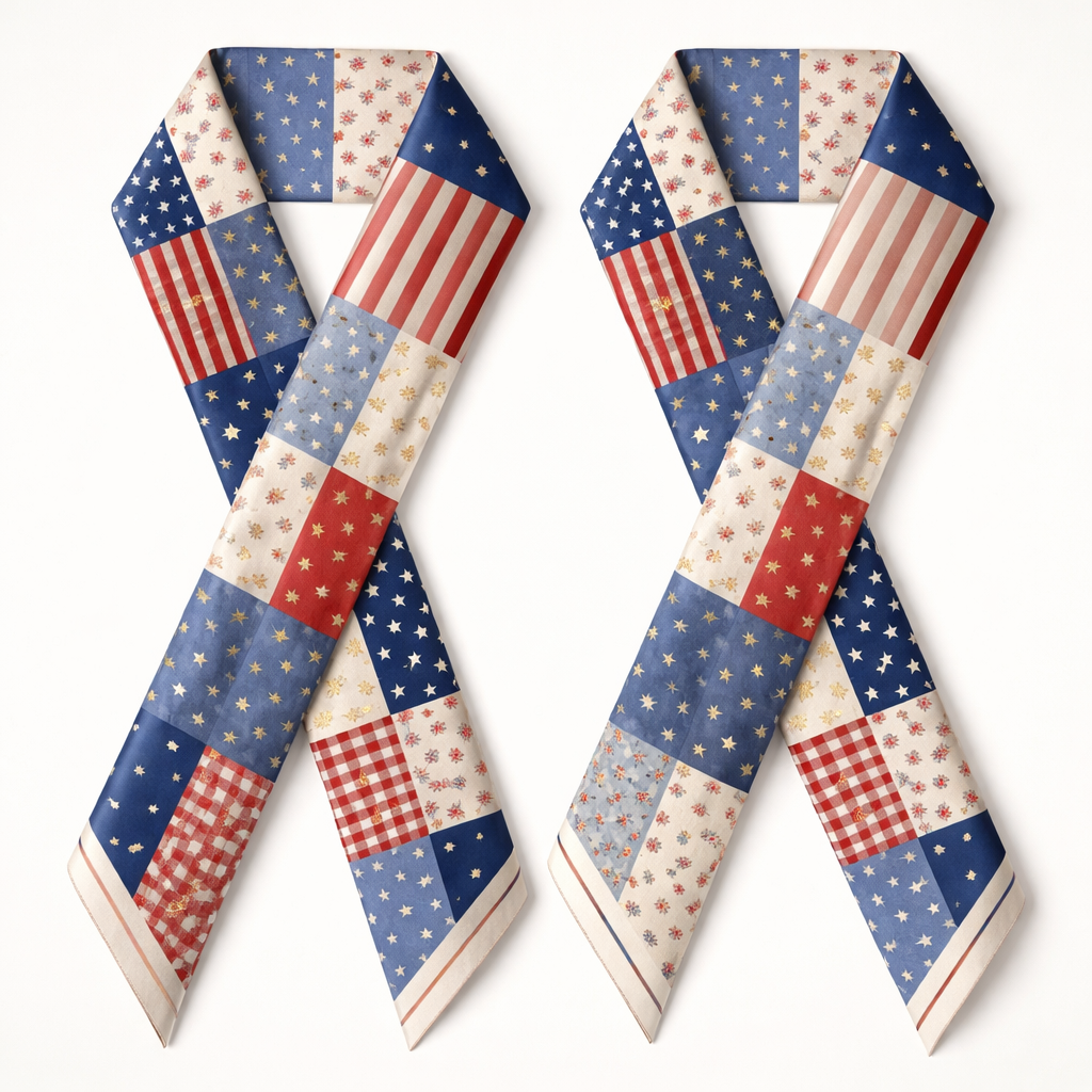 Design a silk twilly scarf that is 5x 86cm that is for the United States of America’s 250th birthday. No words or logos. Ralph Lauren vibe. Way simpler. Even more simple. Add a subtle element of celebration. Make it preppy. Add feminine touch no bows. Add patchwork like from quilts less sweet too much like a picnic table again no bows make Dior style, classic style, show front and back