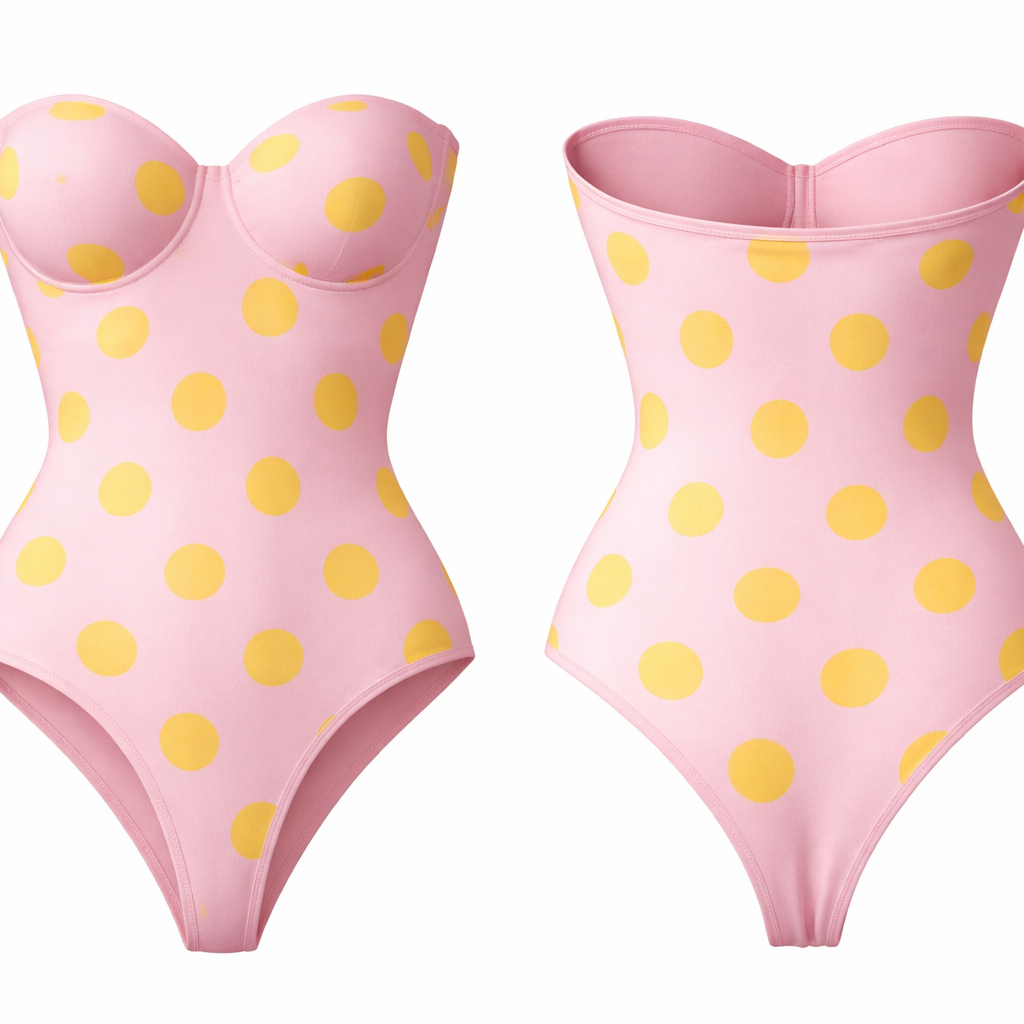 Shape wear no ai model all cotton seamless g string white and black pocker dots strapless built in bra just in bodysuit pink and yellow pocker dots other way around bigger dots medium size dots, classic style, show front and back