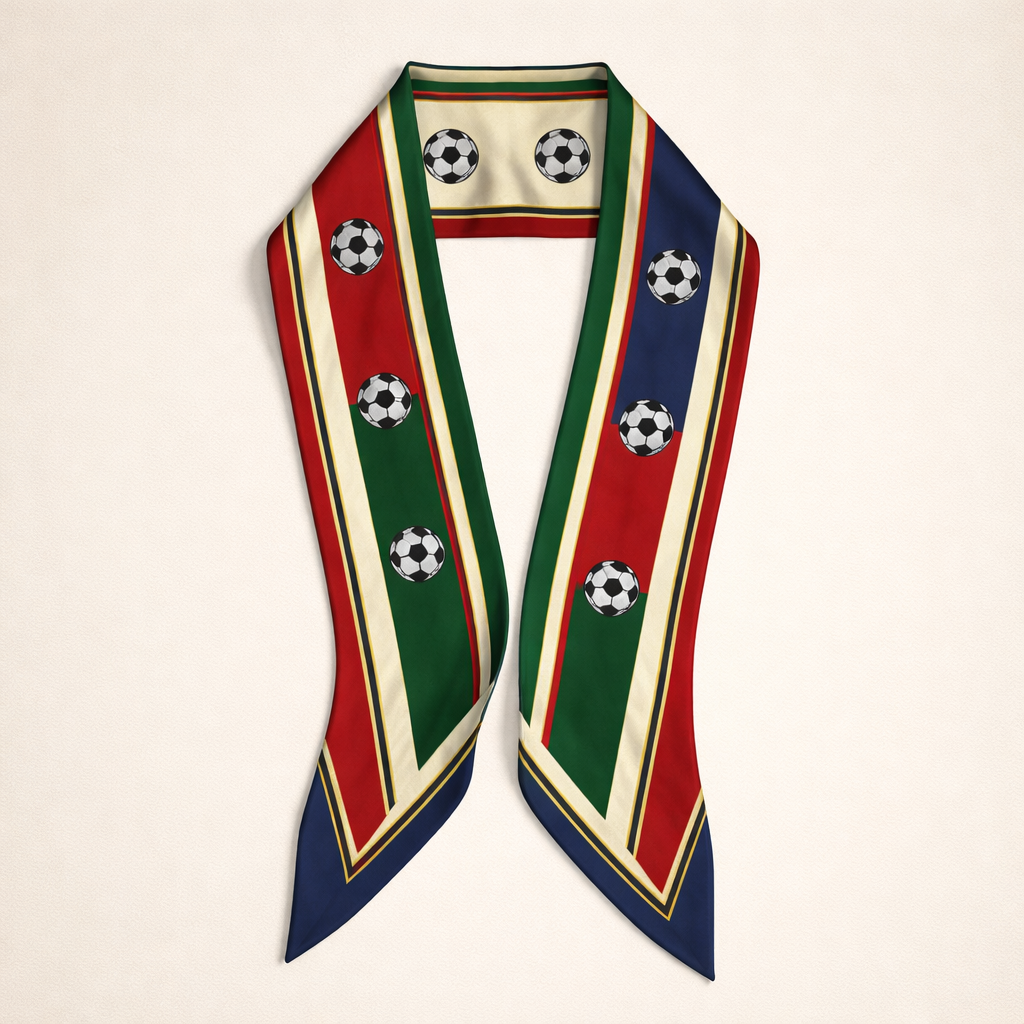 Design a silk scarf that is 5x86cm that is generic for the World Cup 2026. No logos. Heritage look and classic and simple. With angled corners without any words just colors and soccer balls
