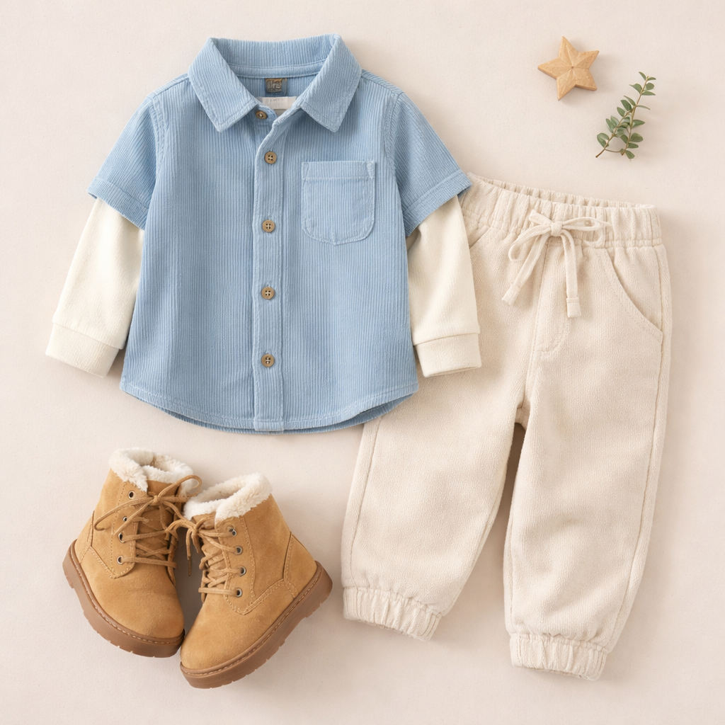 Powder blue or ice blue corduroy shirt for toddler with cream corduroy pants and cream long sleeves under shirt with cam...