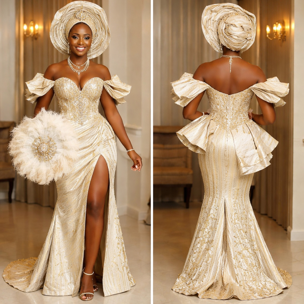 You’re a fashion designer and a stylist who knows Africans fashion like the Veekee James, can you create and design me a unique Aso oke outfit for my wedding - The design should be simple but captivating and unique. Remember Aso oke can be stiff not flowy , african style, show front and back