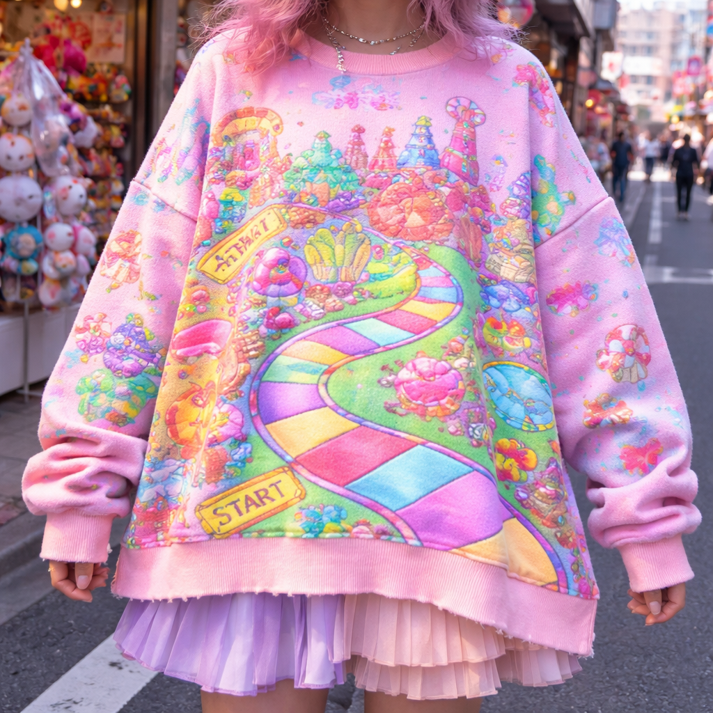 Japanese Street fashion design: **Oversized cotton sweater with a vibrant neon candy land board game pattern. Boxy fit, dropped shoulders, and a raw hem, inspired by Harajuku playful layering.**