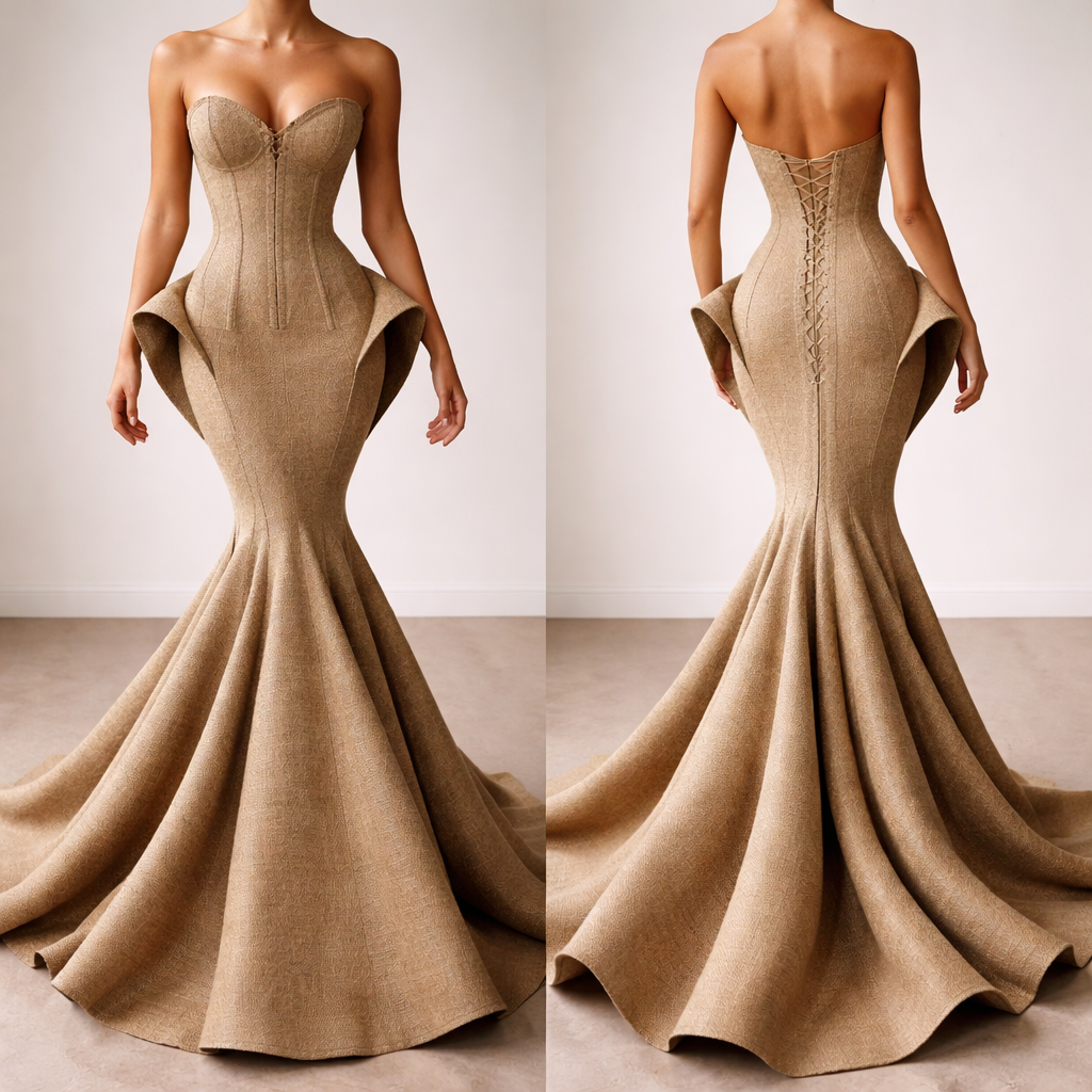 I want a dress in jute fabric snatched corset side hip panels and a structured standing train