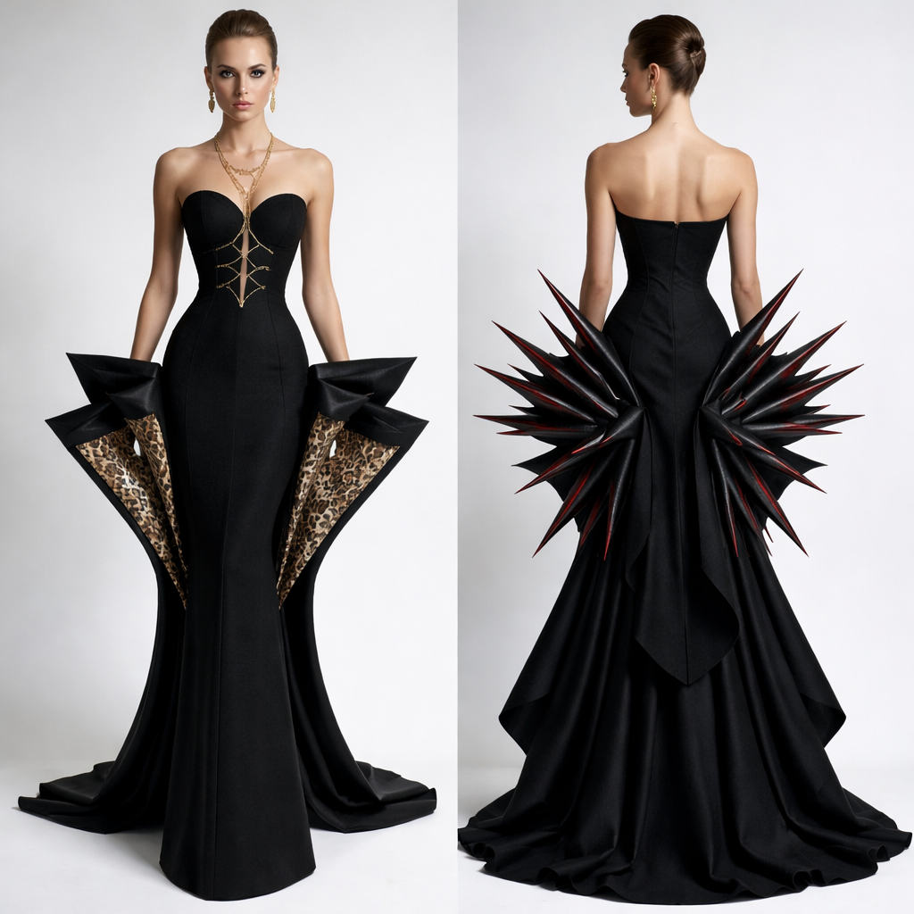 Black jute corset sort dress, extremely fitted silhouette, no mermaid shape, no round flare, structured hip panels that stand outward like sculptural folded panels, panels start at upper thigh and extend outward, inside panels leopard patterned fabric, outside clean black , back-only explosion train constructed from layered panels, architectural couture design, dramatic but clean front, high fashion, structured not flowing then red and black spikes coming out the back add gold cris cross circle chains in the front chest to mid stomach, classic style, show front and back