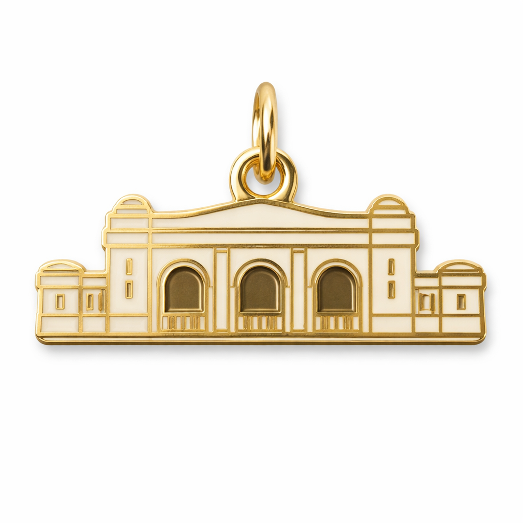 Make an enamel charm of the silhouette of Union station in Kansas City but very simple. Without any words