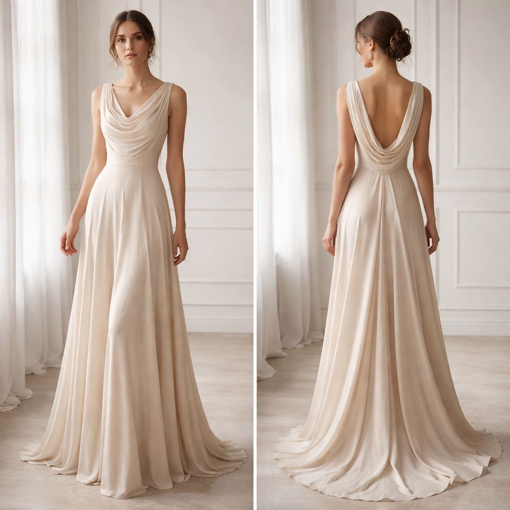 Crée une robe longue soft et élégante en tissu dampé premium. Je veux une coupe fluide et raffinée avec une silhouette ...