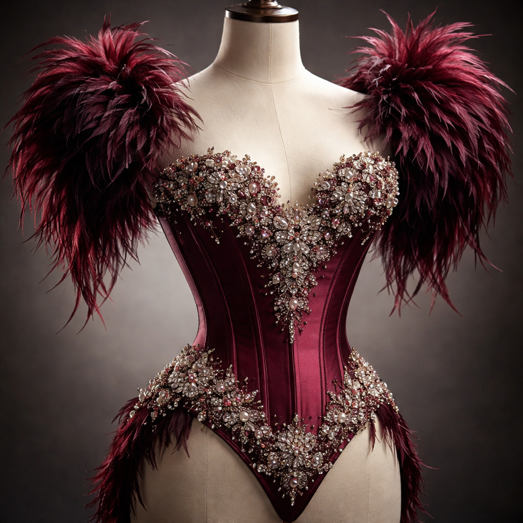 An elaborate hand-beaded corset with intricate floral crystal embellishments, dramatic feathered shoulders, rich burgundy satin, displayed on mannequin, studio lighting, editorial photography