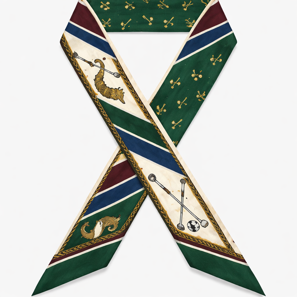 Design a silk scarf that is 5 x 86cm that wraps around a handle of a handbag American Sporting Heritage Classic American preppy silk twilly inspired by traditional sporting scarves, collegiate elegance, and timeless country-club style—refined, understated, and archival Incorporate this style specifically for Kansas City, MO hosting the world cup 2026. More simple with no words or logos More clear and simple Image is distorted, classic style, show front and back