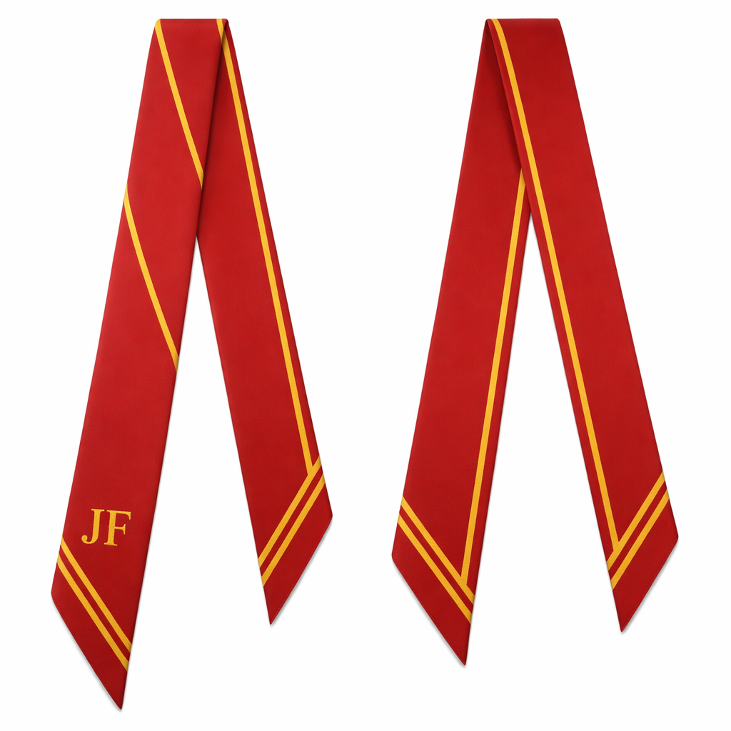 Design a twill scarf that is 5 x 86cm with oblique edges. Have it be mostly red with yellow lines. Keep it super simple and tailored Add JF initial at the bottom, classic style, show front and back