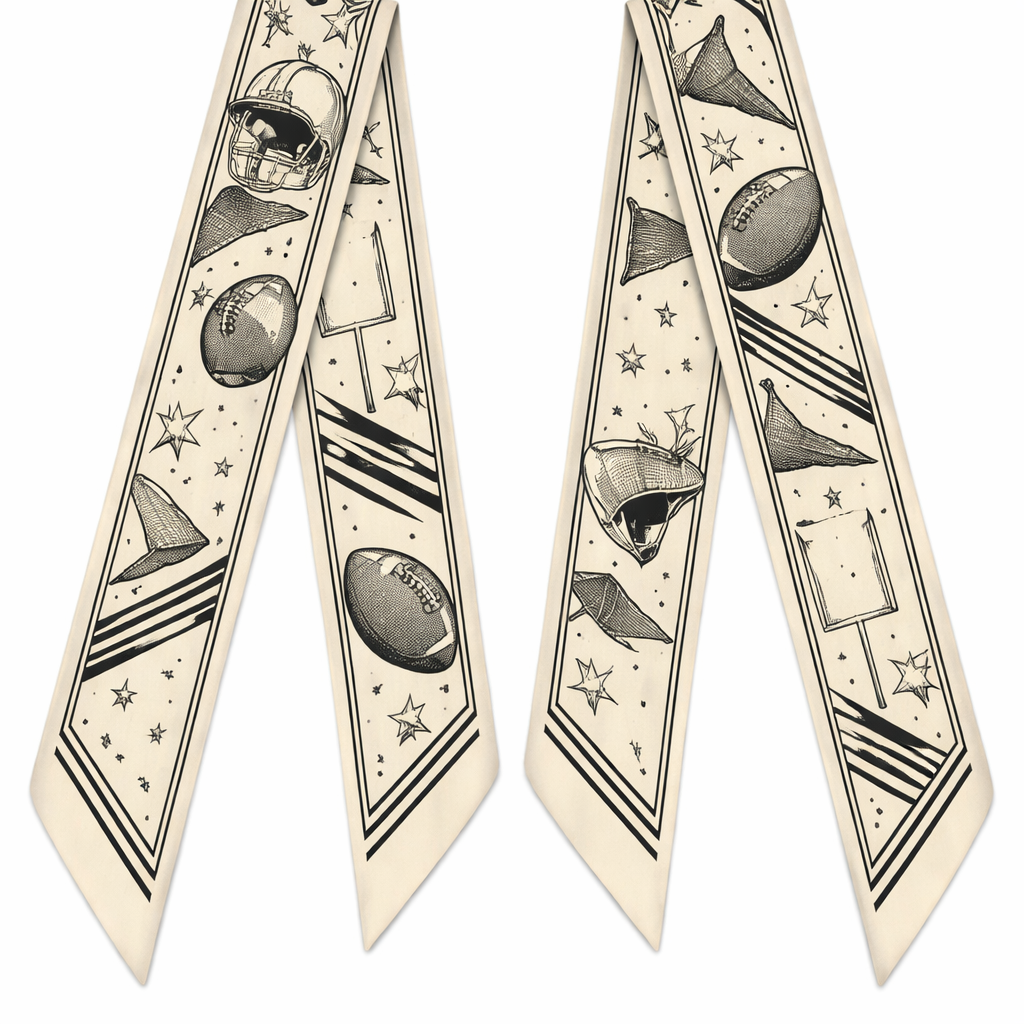 Design a silk scarf that is 5 x 86 cm with oblique edges. It will be wrapped around a handle of a handbag. That has a football vibe. No colors. Keep it vintage. No words or logos. All American and a lot more simple. Even more plain