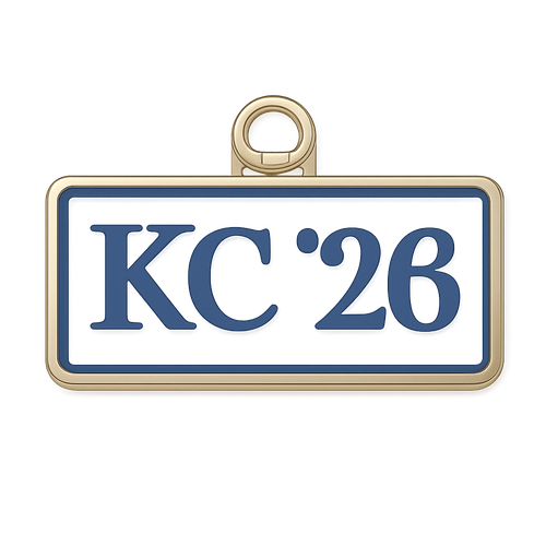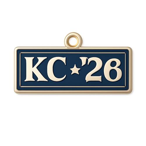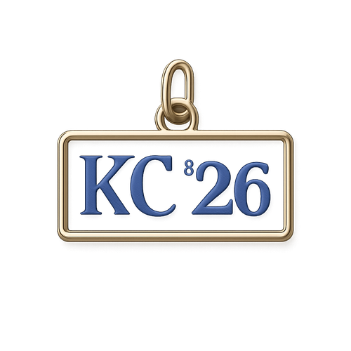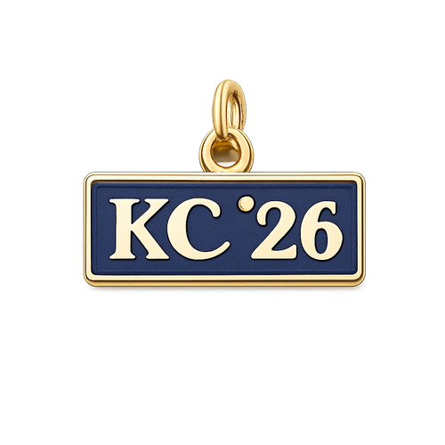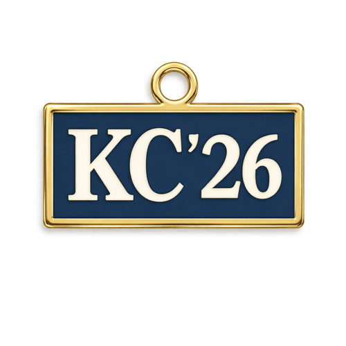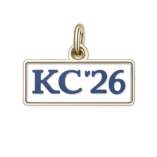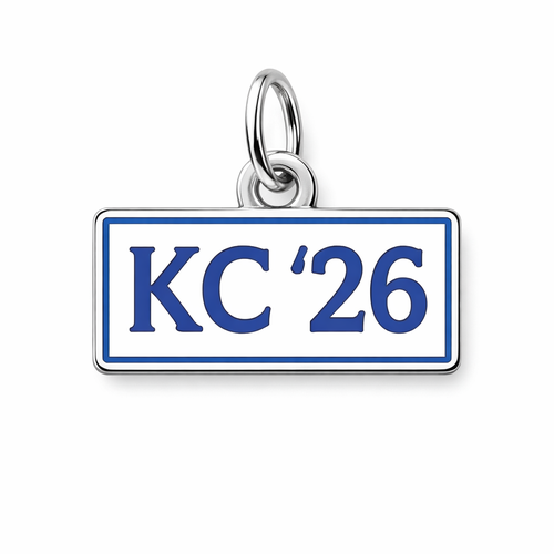 Design a 1 inch enamel charm that says KC ‘26 in rectangle design use blue letters and white background with gold as the...