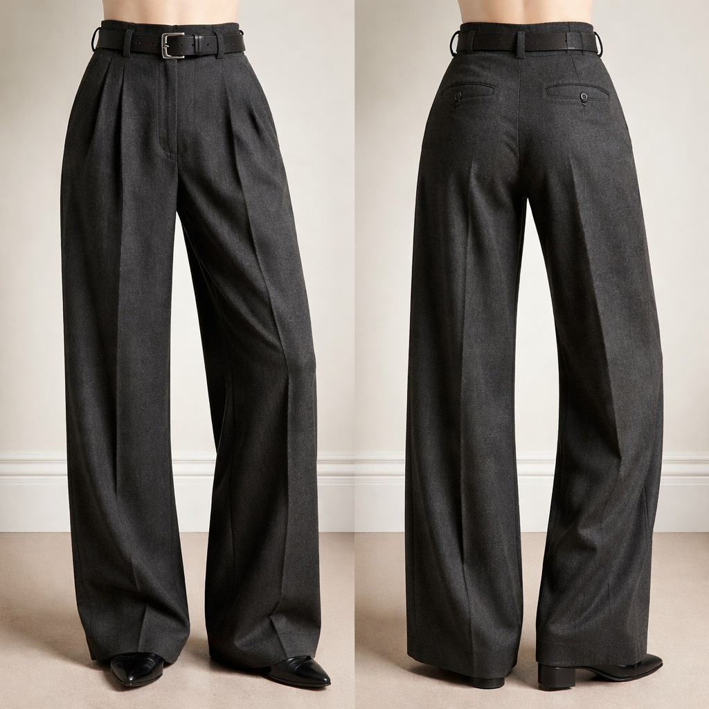 The Tailored Trousers — “Utility Wide Leg” Silhouette High waist Wide leg (1940s ration style) Front pleat Deep waistband with belt loops Fabric Charcoal wool or heavy twill
