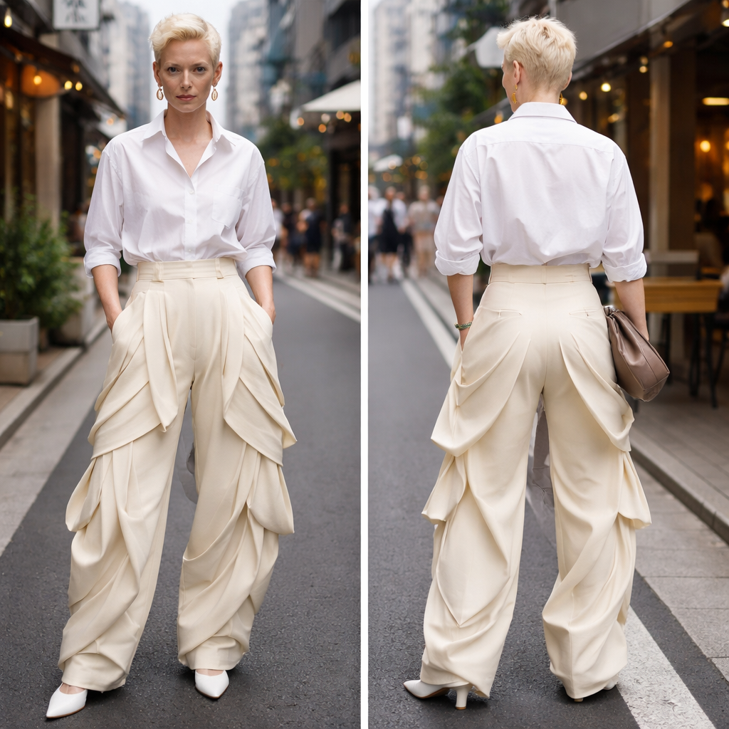 To create a pair of trousers for Tilda Swinton using the fabric manipulation technique shown in your images. They are to be casual, going out on a coffee date. follow these steps: ### Design Concept 1. **Silhouette Inspiration**: Consider Tilda Swinton's unique style, often characterized by avant-garde silhouettes. Incorporate a wide-leg or tapered design to reflect her fashion-forward attitude. 2. **Fabric Choice**: Select a lightweight fabric that holds shape well, like a structured cotton or a blend with some stretch. This will enhance the drape and allow for the manipulation technique. ### Pattern Development 1. **Base Trousers Pattern**: - Start with a basic trousers block pattern that fits well. Adjust the waist and hip measurements to ensure a comfortable fit. 3. **Finishing Touches**: - Construct the waistline and add any closures (like a zipper or buttons). - Hem the trousers to the desired length, allowing for a slight flare or taper at the bottom. ### Styling - Consider pairing the trousers with a fitted top or an oversized jacket to balance the proportions. - Accessories can include bold jewelry or unique footwear to complete the look. , japanese_street style, show front and back