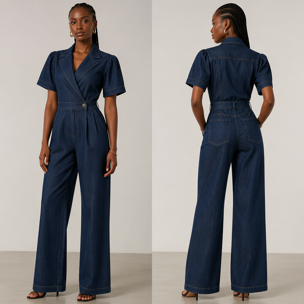 A Jumpsuit design, made of Denim, for Formal, suitable for Summer, in Korean Fashion style. Ghana fashion aesthetics.
