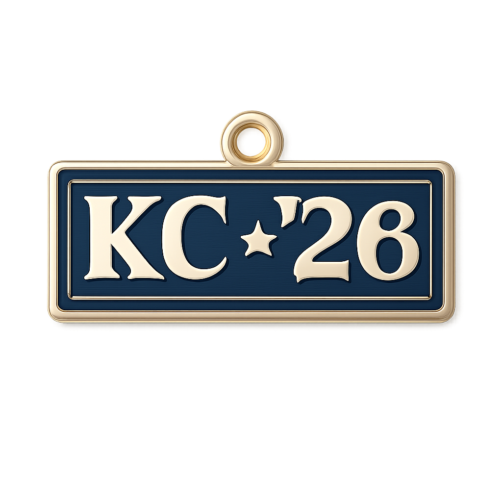 Design a 1 inch enamel charm that says KC ‘26 in rectangle design use blue letters and white background with gold as the...