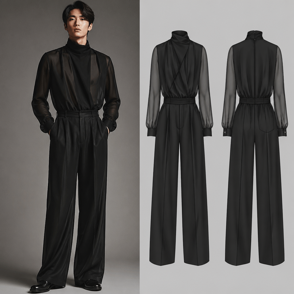 photorealistic fashion design, A Male Jumpsuit design, made of Chiffon, for Casual, suitable for Fall, in Old Money + Elegant + Korean Fashion style. squid game theme, squid game frontman black. Design with modest coverage., old_money style, just the design no text