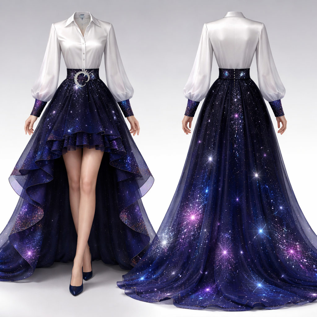 It’s so moody and delightful from the front it’s short and from the back is tall and it’s a skirt and a classic shirt with a blue glow dark blue obviously and it comes with the moon colour dark blue black purple and there’s so many sparkles and stars, show front and back