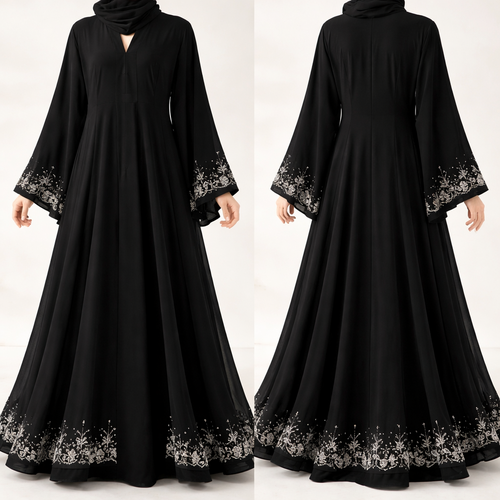 اريد عباية سوداء بقصة كلووش وشغل يدوي بسيط من عالاطراف وقماش دبل شيفون