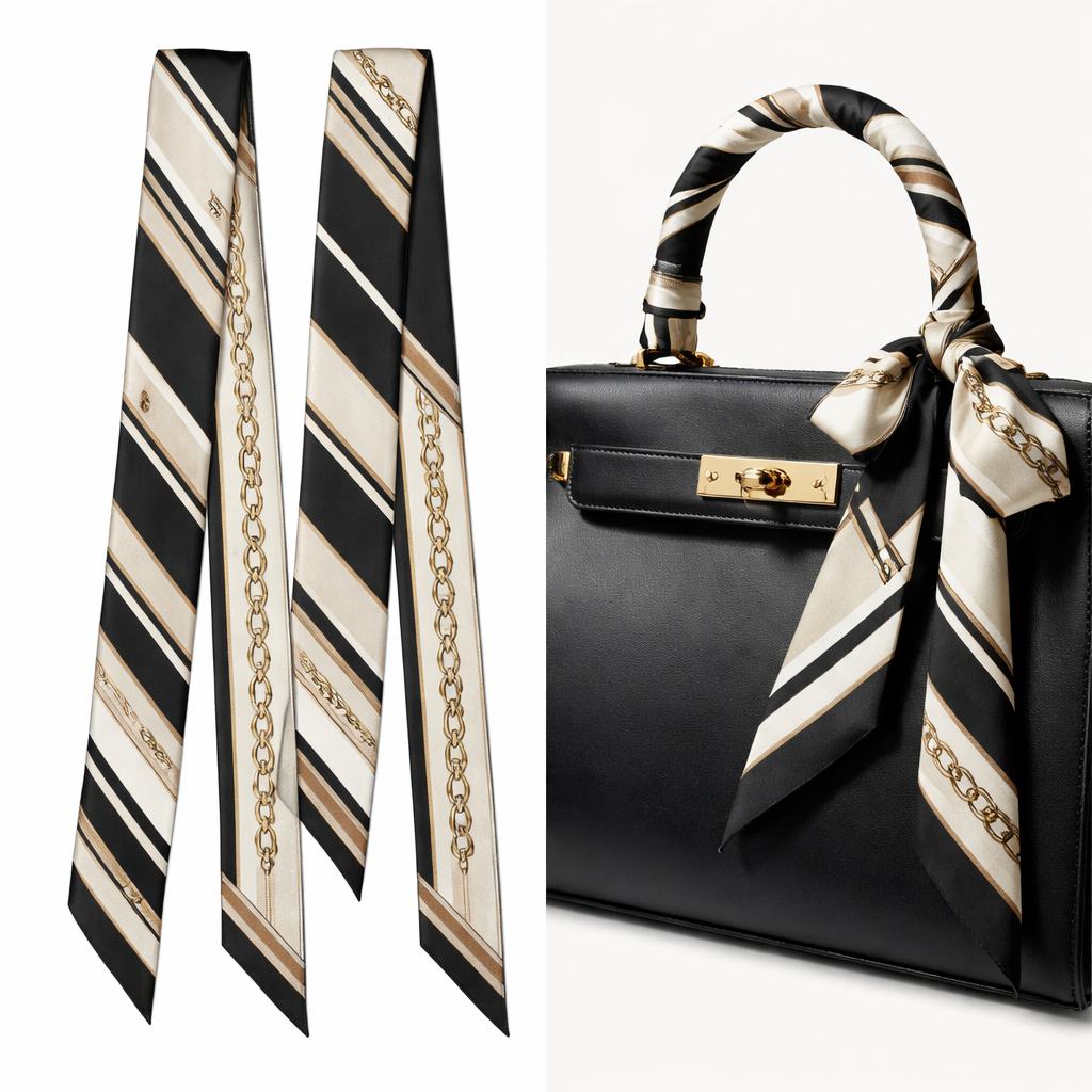 Design a scarf that is 5x86cm to be wrapped around the handle of a handbag for a lifestyle piece. Keep clean and simple. Something Audrey Hepburn would wear more geometric add a tailored touch