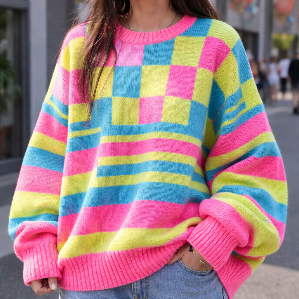 Japanese Street fashion design: Oversized cotton knit sweater, bright neon pink, yellow, blue, and green in checkerboard and stripe patterns. Dropped shoulders, relaxed fit, with playful chunky ribbing at cuffs and hem.