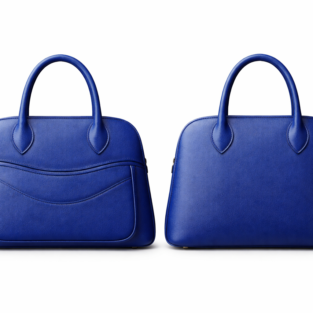 Male me a leather bowler bag unisex in the stile of hermes bolide. No hardware. But different than hermes. Make in royal blue textured leather. Add a unique front pocket. , glamorous style, show front and back