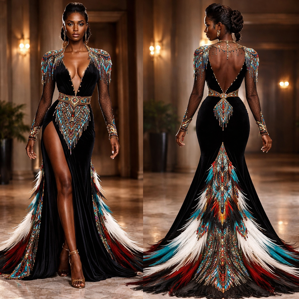 Modest but sexy, Native American, African, West Indian , formal style, show front and back