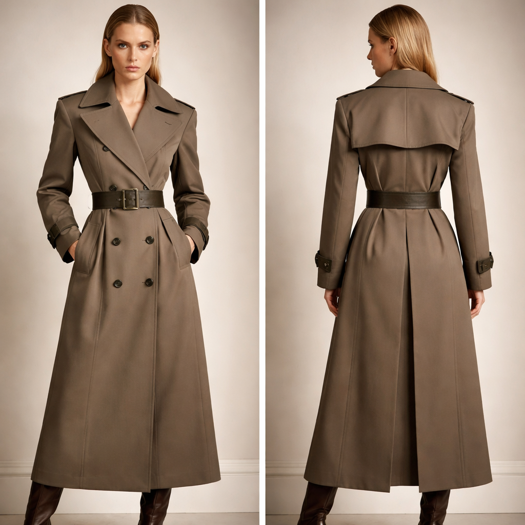 LOOK 1 — The Authority Trench Main Fabric: Gabardine Colour: 18-1312 TCX – Bungee Cord Secondary: 19-0810 TCX – Wren (topstitch or belt) Silhouette: Long tailored trench Strong shoulder Sharp collar Deep cuff tabs Structured belt Gabardine gives crisp authority. Bungee Cord keeps it serious, not muddy., retro style, show front and back