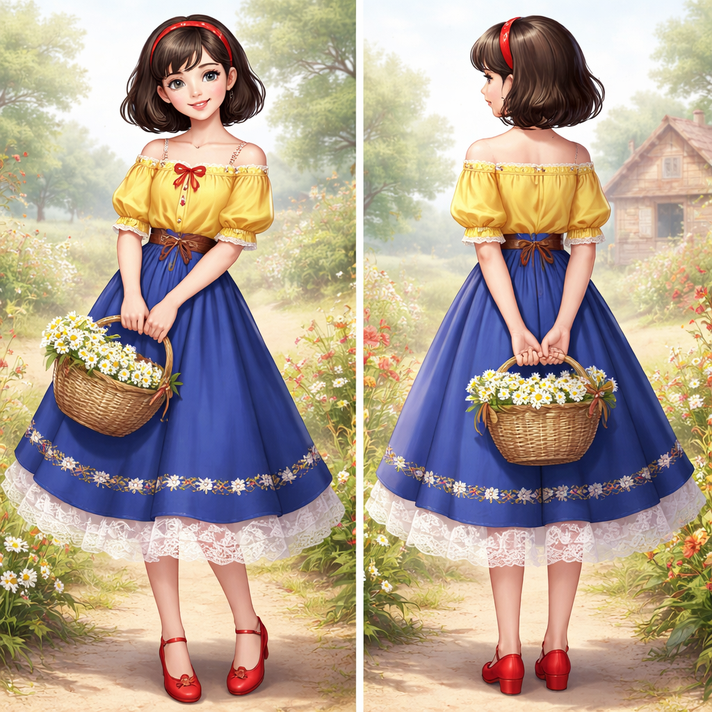 A 14 year old teenage girl with a European face and ebony black hair in a short bob with a red headband wears yellow top and a royal blue skirt and red shoes , cottagecore style, show front and back