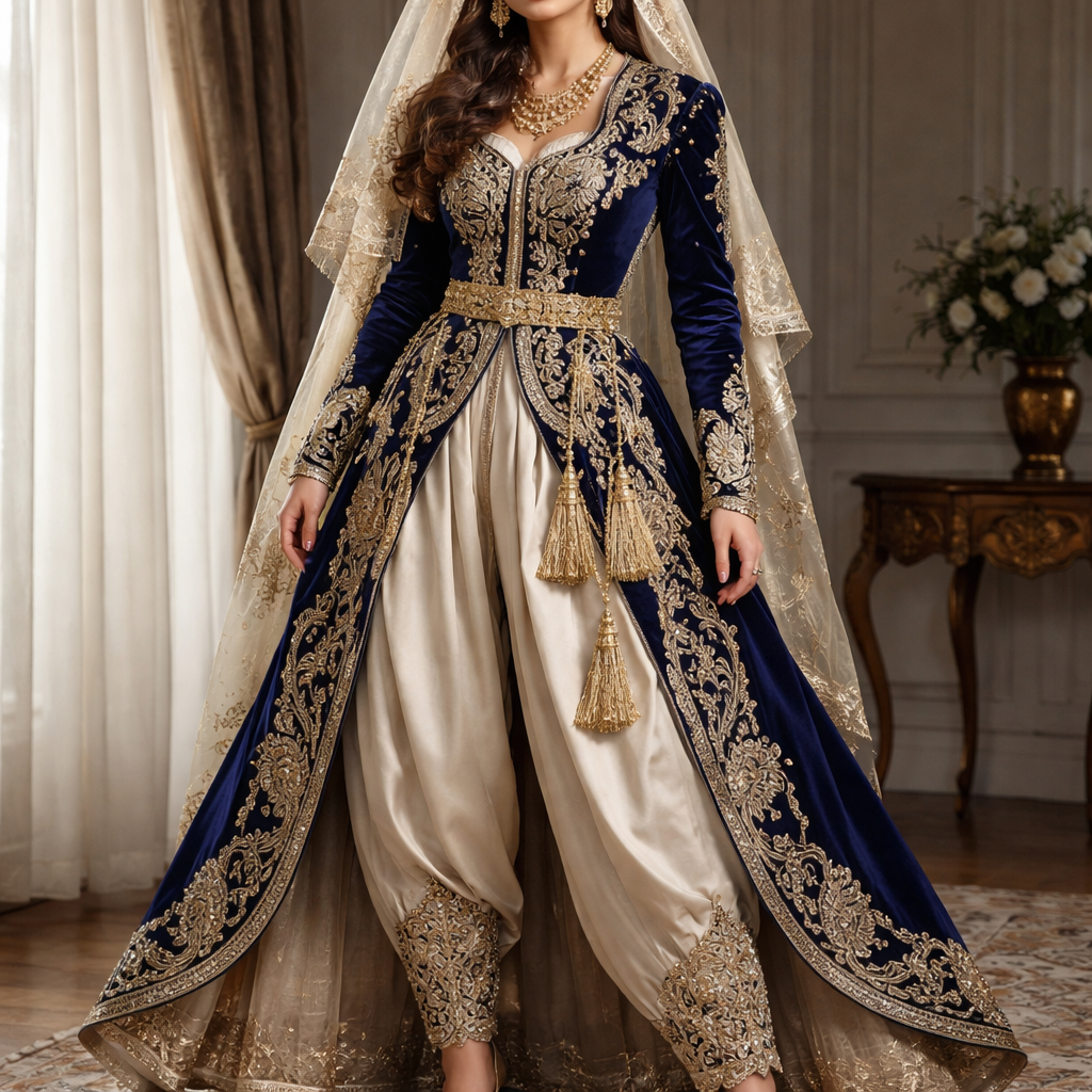 Agis comme un créateur de mode. Conçois une tenue féminine inspirée du karakou, du seroual mdouer et du caftan algérien. Utilise velours brodé, soie et tissu brodé. Couleurs : rouge ou bleu marine avec beige. Accessoires : mharmma, ftoul dorés et mssayess. , classic style