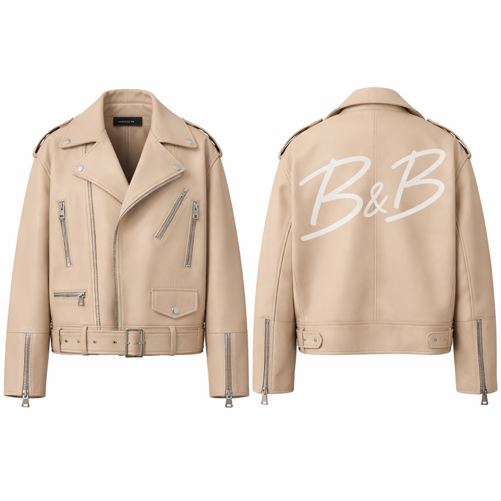 One jacket leather biker unisex cool vintage oversized with B&B written on the back signature style in nude tone with white writing Balenciaga style motorbike , minimalist style, show front and back