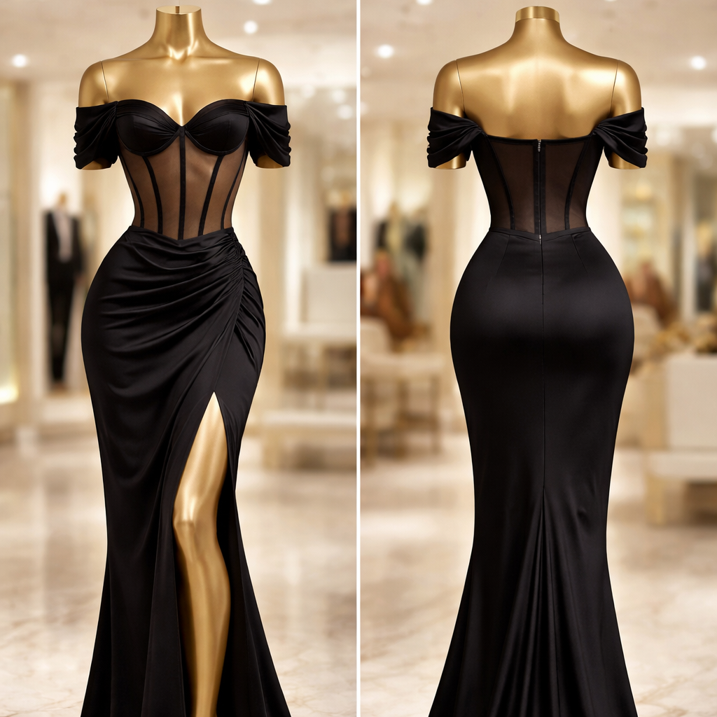 Create a fashion gown on either a gold mannequin that looks like it belongs to a high end store of an invisible model (3D). The dress is a black silk fitted dress with a corset. The corset has a caramel brown mesh. The boning of corset is covered with black silk. The skirt has a black invisible zipper at the back. The dress is off shoulder with three inches of sleeve. There is a pleated loose drape of black silk at the cup. The skirt is high waisted and starts above the belly button. , show front and back