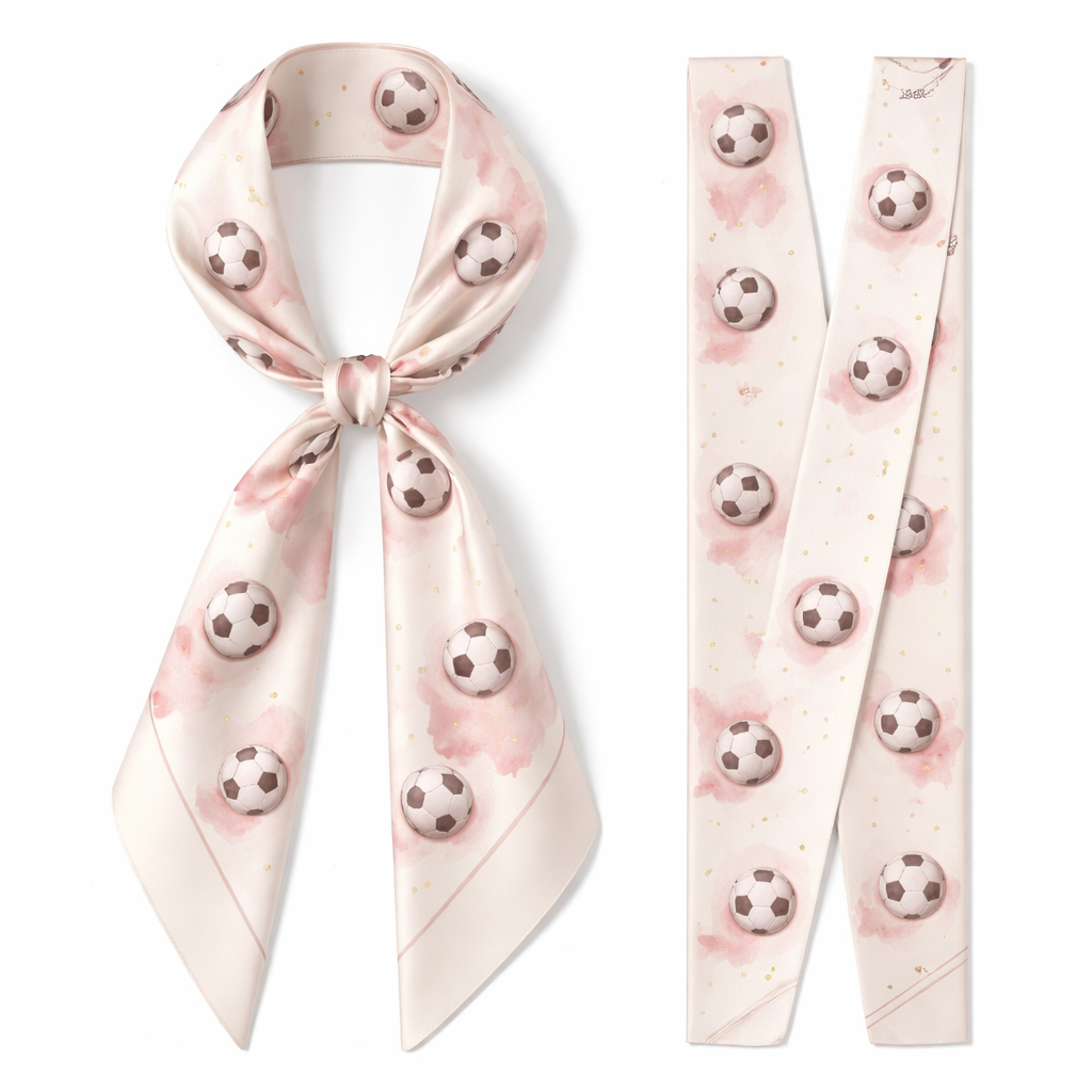 Design a silk scarf thanks 5x 86cm to be wrapped on the handle of a purse. No logos or any school relation. Make it footballs . Way more simple and tailored just football Ivory with feminine touch