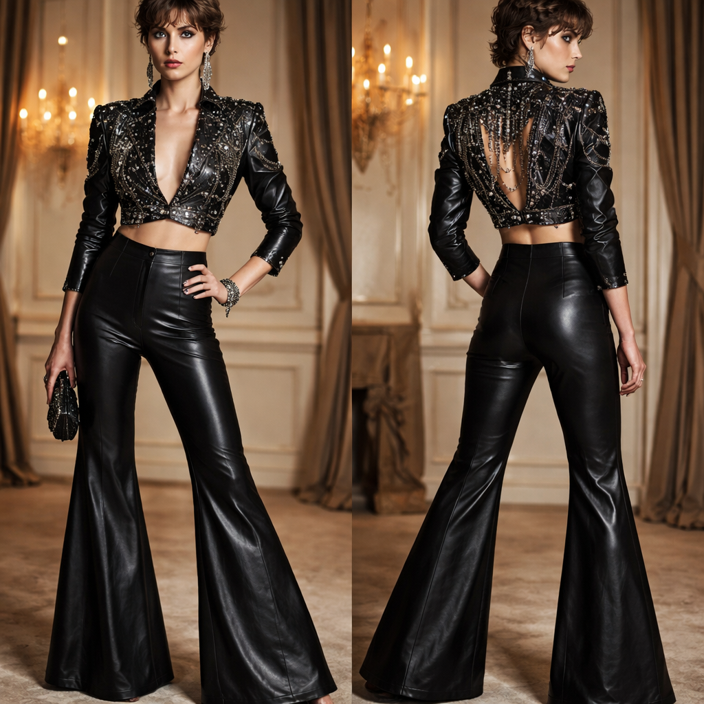 Arnold Scaasi evening pajamas 1966 Androgynous , leather style, show front and back
