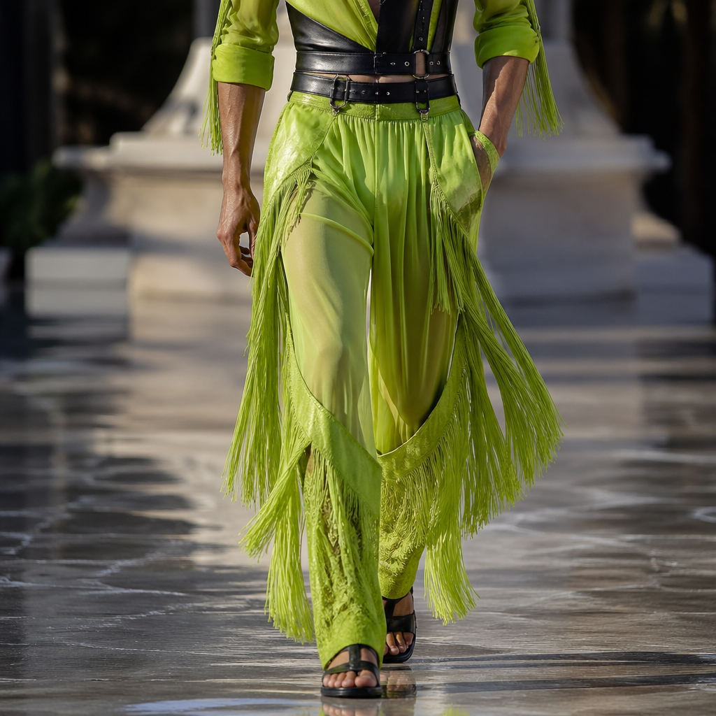 photorealistic fashion design, A Male Pants design, made of Chiffon, for Wedding, suitable for Spring, in Flapper + Active + Leather style. lime green, dramatic. Design with modest coverage., flapper style, just the design no text