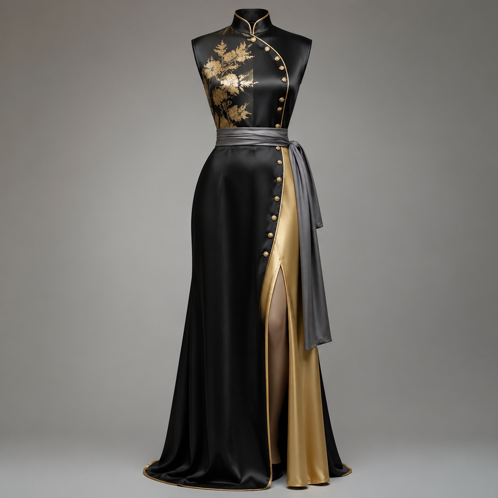 A Female Dress design, suitable for Summer. je veux je veux une longue robe noire et or la bande avec une bandeau sur le côté qui couvre une partie de la jambe gauche avec des boutons dorés et un col mao. le tout doit être un mix entre le style asiatique et un style rétro américain. ensuite tu ajouteras une ceinture grise. CM fashion aesthetics.